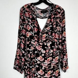 Mink Pink crafty critters black long sleeve maxi dress. Black pink floral print. Back cut out. Zip side closure.