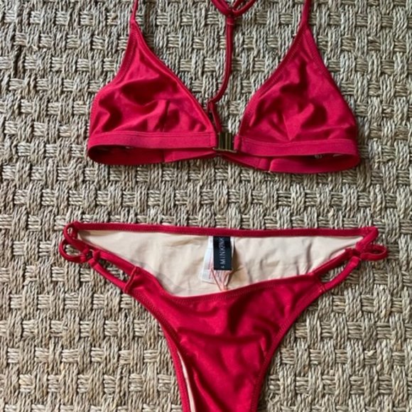 Mink Pink triangle string bikini in ruby red Australian swimwear company Bought as separate pieces, so top is a size S and bottom is a size M 80% poliamide 20% elastane knit fabric in red, lined with tan 92% poliamude 8% elastane knit Gold metal rings and adjusters at sides, back T strap and front closure Worn once, perfect condition from a smoke-free environment