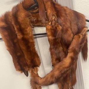 They don’t kill the fox to make this mink shawl. I purchased this from the people who actually protect the foxes. The color is amazing, it’s a golden reddish with different colors through out. Worn around the neck, attached clips to keep together. Looks outrageous on, there’s 7 minks in this pc, no damage, in perfect condition.