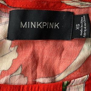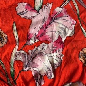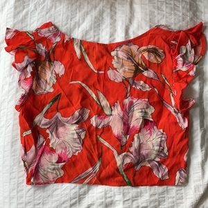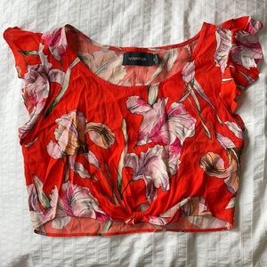 Super cute tie front crop top with flutter sleeves. Deep orange color with pink flowers. Perfect for a tropical vacation!