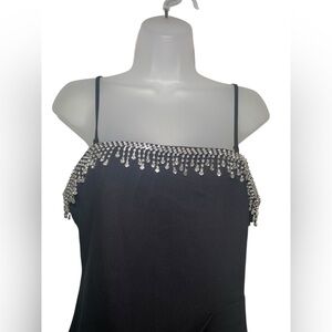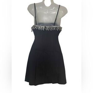 Keywords: MinkPink mini dress, black strapless dress, embellished neckline, ruched party dress, holiday dress, night out dress, medium