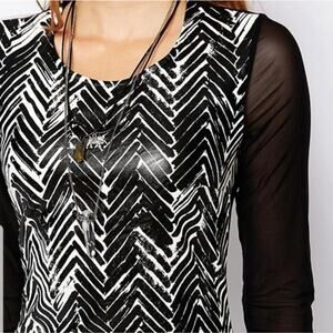 Mink Pink vegan leather dress size Medium. Black and Ivory chevron print front with stretch back and mesh long sleeves. Back zip. Unlined,