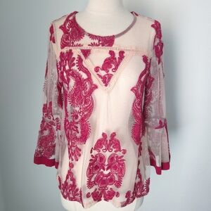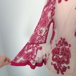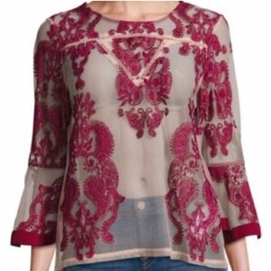 MinkPink Burgundy Red & Pink Paisley Sheer Embroidered Bell 3/4-Sleeve Top