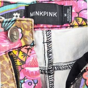 MinkPink Denim Shorts Cheeky Booty Shorts Floral Cheetah Patchwork Print Zip & Button Closure. Stretchy, Small 1/2" vent on side hem.