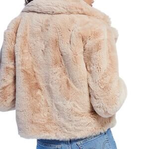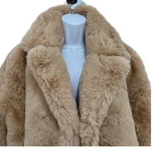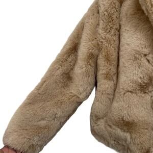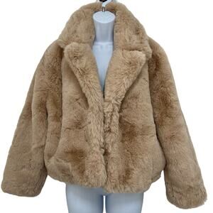 Minkpink Womens Size Large Faux Fur Anya Jacket Coat Tan Fuzzy Plush Cozy Mobwife NWT New Years Eve Fall Winter Holiday Chic Elegant Trendy