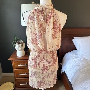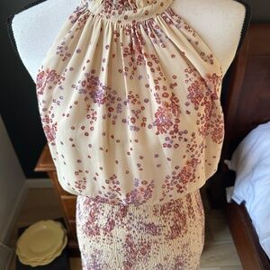 This is a new without tags, never worn Ivory floral mini dress with smocked stretchy bottom and blousy top with open slit back and tie at neck! Absolutely beautiful and so flattering. No stains or flaws. From a pet free smoke free home.