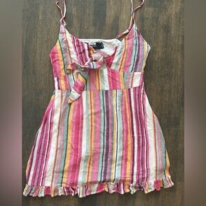 Multi pink cotton (100% viscose). Hourglass. Sleeveless. V-neckline. Zipper closure with hook-and-eye. Fully lined. Front Pockets. 27" from shoulder to hemline. Imported.