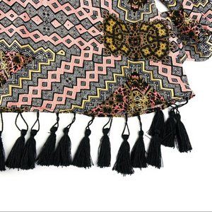 MinkPink Long Sleeve Tassel Trim Graphic Dress. Pink, yellow, and black. Size small. New without tags. 100% viscose.