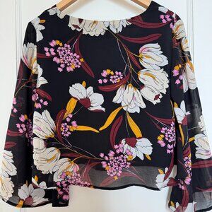 Black crop top in pristine XS condition designed by MinkPink — never worn. Crafted with a floaty silhouette and delicate floral detailing, it features flattering bell sleeves and a cropped hemline for an elegant, statement‑making finish.