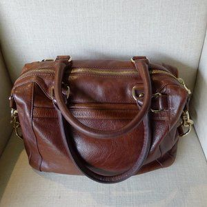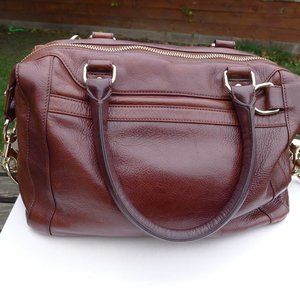 Marks on leather including a dark spot on the exterior pocket. Stains in interior. Handles have darkened somewhat.