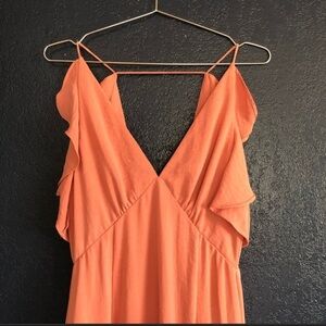 Full length dress with two slits down the front and back. It also features a ruffled sleeve wing, and a deep v cut back with thin straps. Perfect for a wedding or special event. In great condition.