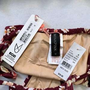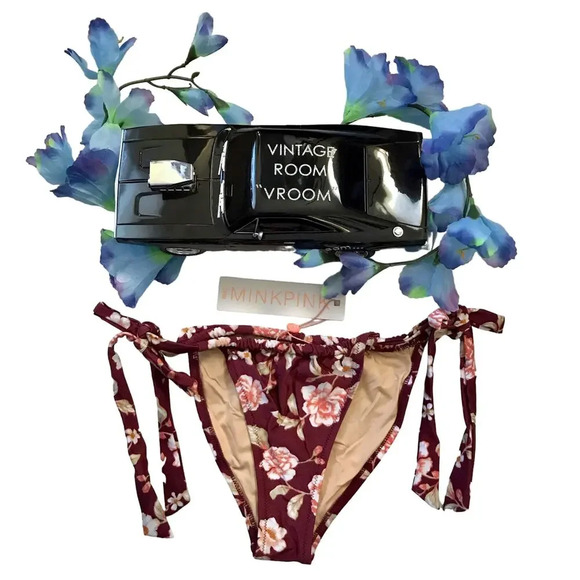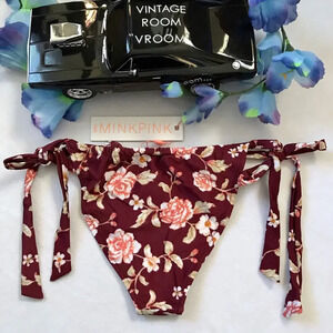 NWT. Swim Bottom for Women Size M. Burgundy with floral design, ties at sides, "cheeky" style, beige internal lining. Pictures are part of description.