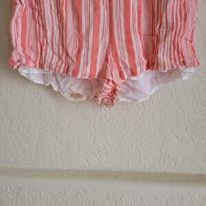 Features: Red and white striped crepe (100% Viscose). Romper. Strapless. Straight neckline. Elastic waistband. Pockets. 29" from bust to hemline.