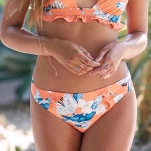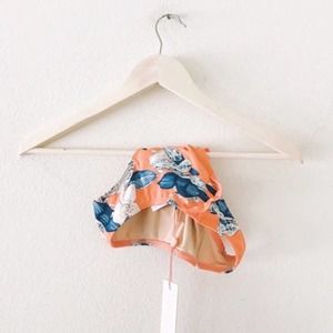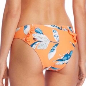 Minkpink ‘Enchanted Forest’ bikini bottoms. Orange with blue floral and feather print. Ruffles on each side. Cheeky hipster style.
