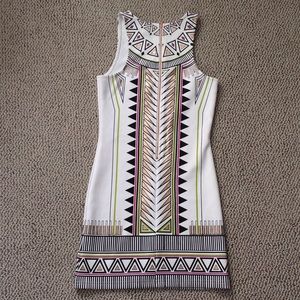 Metallic detailing with a rose gold zipper up the back. Neoprene style fabric. XS