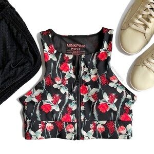 Minkpink Zip Front Crop Top Sports Bra in Black with red floral pattern. Fabric provides stretch with mesh lining inside and removable bra cups. Front zip closure. Can be worn as a Crop Top or a sports bra. Brand new with tags. Last picture to show fit not actual color/pattern. 13” long with 30” bust.