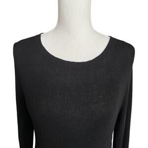 Minkpink black high low scoop neck sweater, size large, lightweight, crisscross front design, with high front low back, approximate measurements length 17.5” back length 31”, armpit to armpit flat 17.5”.