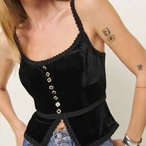 Up top. Shop the Minna Velvet Top from Reformation, a sleeveless top with a scoop neckline, lace trim, and a split hem.
