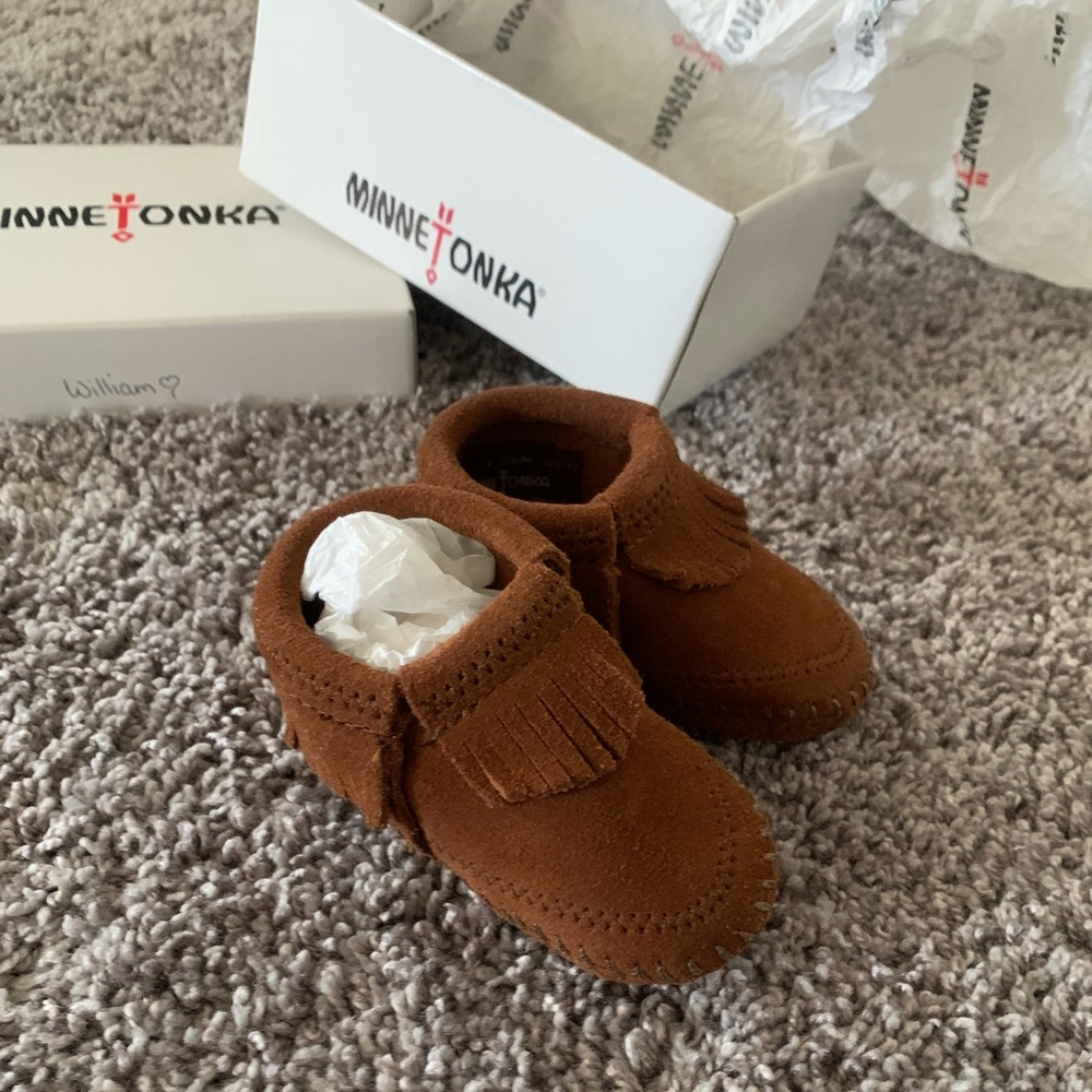 Used but in basically new condition. I think my son wore them once.....? Super cute moccasins and the ‘tongue’ stretches away from the shoe so it’s easy to get on. Size 2! Smoke free pet free