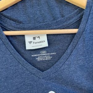 The Minnesota Twins Women's V-Neck Short Sleeve Jersey Tee in size L is an officially licensed baseball shirt by Fanatics. This blue shirt is perfect for female fans of the Minnesota Twins, featuring the team's logo and colors. Made for the regular season, this jersey-style tee is a stylish and comfortable way to show support for your favorite MLB team.