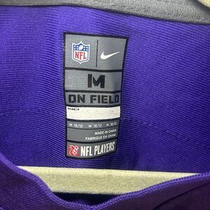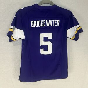 The product is a Minnesota Vikings Teddy Bridgewater #5 NIKE On Field Jersey in youth medium size. This officially licensed NFL jersey by Nike features the player's name and number, representing the Minnesota Vikings team in the National Football League. The purple jersey is designed for unisex children and is a perfect item for young fans looking to show support for their favorite football team and player. Made in China, this high-quality jersey is ideal for wearing during regular season games or as a collectible piece of fan apparel.