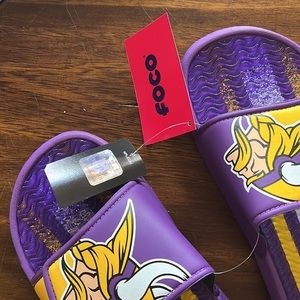 Brand New! Tags attached in original packaging! Minnesota Vikings team gel slides! Men size Large 11/12! Super comfy! Nice to wear out or around the house to show your support for the Vikings! FOCO!