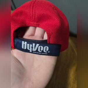 The product is a Men's Minnesota Wild NHL adjustable hat featuring a red, white, and blue color scheme. It is designed with a hook and loop closure for a customized fit and represents the National Hockey League (NHL). The brand is Hyvee and it is a one size fits all cap suitable for hockey fans.
