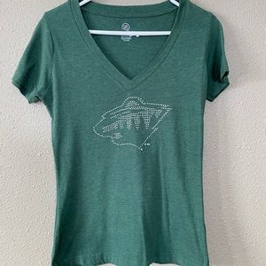 Minnesota Wild NHL Tshirt. Size Medium. Some slight piling, and small hole in armpit (not visible unless arm is straight up). Cute jeweled studs on Wild emblem.