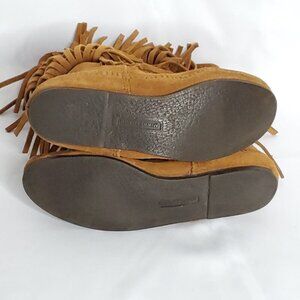 Minnetonka 3 Layer Fringe Moccasin Boots 9 Brown Suede Mid Calf Boho Hippie