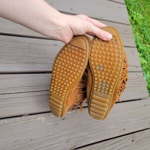 Minnetonka 5-Layer Fringe Wheat Tan Suede Leather Knee High Mocassin Boots