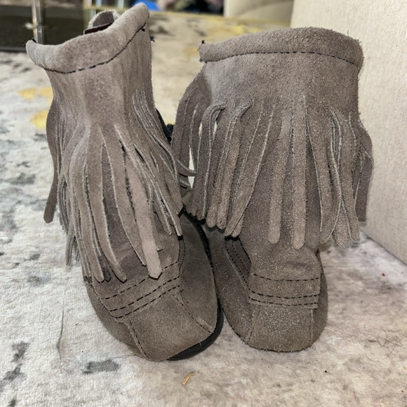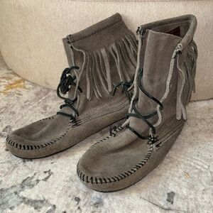 Grey size 5 Minnetonka booties with fringe perfect condition just needs new laces