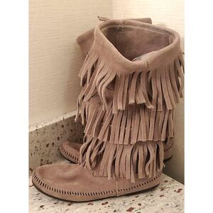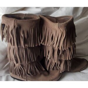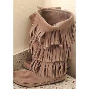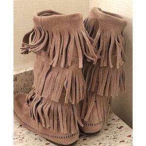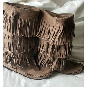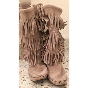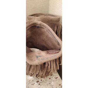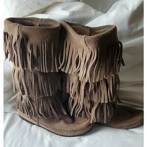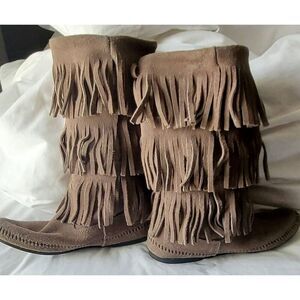 Gray mid calf suede fringe boots. Slight coloration inside boots. Good condition
