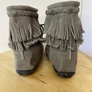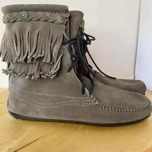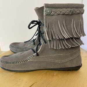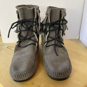 Minnetonka Ankle Boot Moccasins Women Sz 8 Hard Sole Fringe Boho Hippy Gray