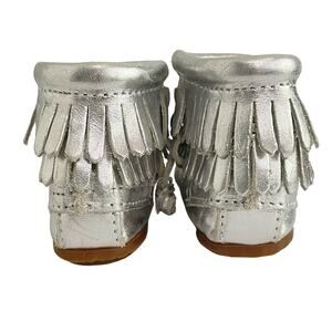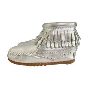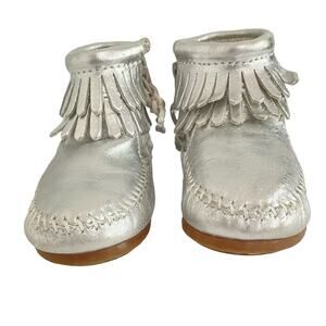Minnetonka Aria Silver Fringe Moccasin Girls 6 Metallic Ankle Bootie Rubber Sole