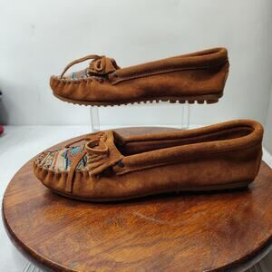 Minnetonka Arizona Kilty Moccasin Shoes Womens 8 Brown Leather Embroidered
