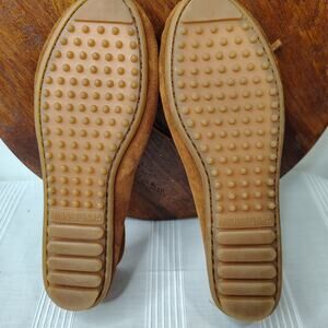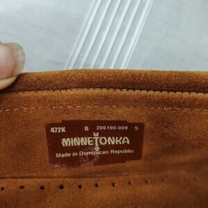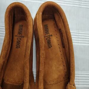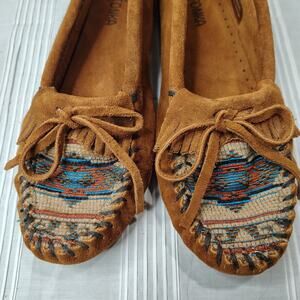 Minnetonka Arizona Kilty Moccasin Shoes Women's size 8 Brown Leather. Embroidered Aztec design with short tassels and leather tie. Hard Sole slip-ons.