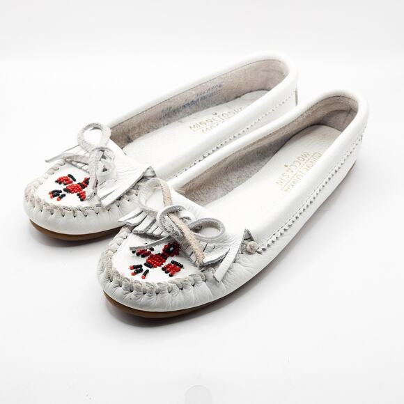 Minnetonka Beaded Leather Flats White Red Women’s 6 Folk Boho Style