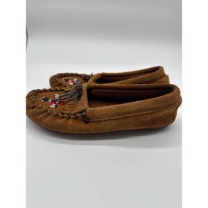 Minnetonka Beaded Thunderbird Leather Driver Moccasins Youth 3 in good condition, leather shows signs og wear but no holes or rips. Soles show wear but no holes