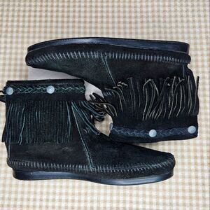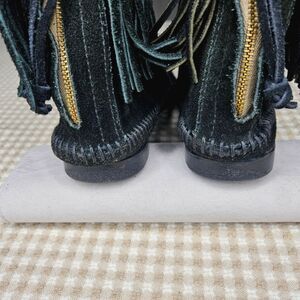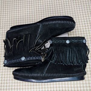 Minnetonka Black Fringed Suede Back Zip Metal Conchos Anywhere Ankle Boots