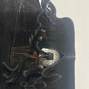 Great condition booties with minor flaws as shown. One zipper as the missing suede pull strap but the other boot has it a dcouls be removed if needed or one added. The feather on one shoe is gone and the other one has a little bit left but could also be cut out. Stylish black suede moccasin boots with fringe details. Perfect for casual wear.