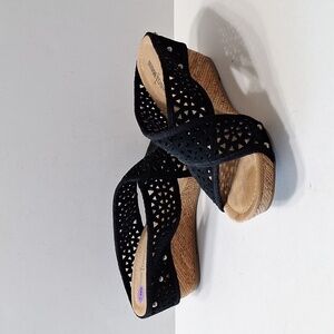 Minnetonka Black Tan Lainey Witchy Boho Cut Out Suede Wedge Sandals Size 8