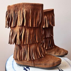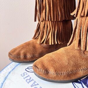 Minnetonka Boho Suede Fringe Brown Mid Calf 3 Layer Boots Size 7