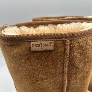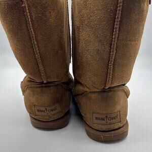 Gently Used Minnetonka Boots. These are a women's 10. Light brown / tan color throughout. Classic Ugg boot look to them. Inside is real fur from sheep.