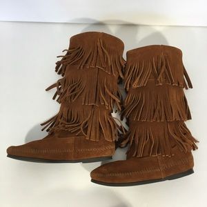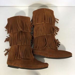 Minnetonka Brown 3-Layer Fringe Pull On Boot, Women's 6