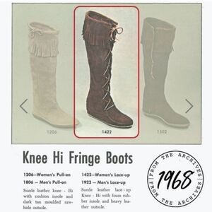 Stand out at the next festival with these iconic lace-up boots. They’re made by hand today from the same simple design that was introduced in 1968. Genuine suede is supple, soft and comfortable. These moccasin boots lace up high to just below the knee and simple fringe sways from the boot tops with every step.