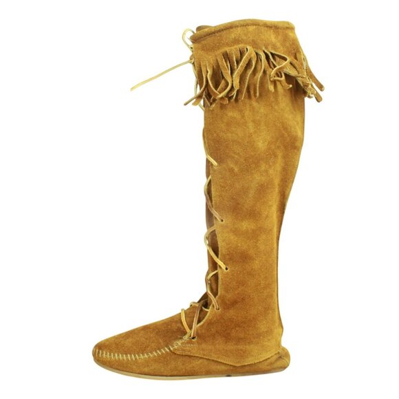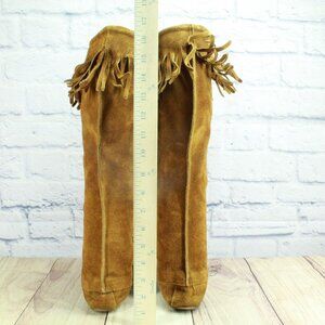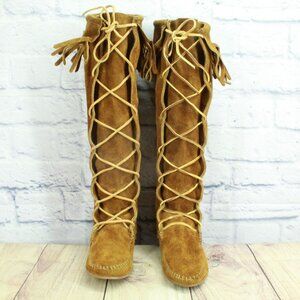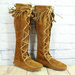 Minnetonka Brown Suede Knee High Lace Up Moccasins Festival Fringe Size 6