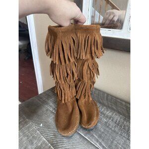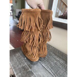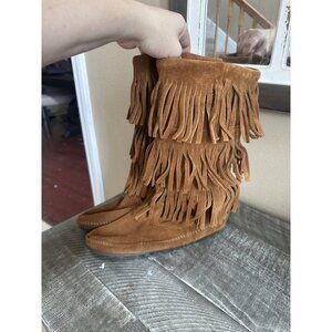 Minnetonka Brown Suede Leather Triple Fringe Moccasin Boots Womens Sz 9 1632