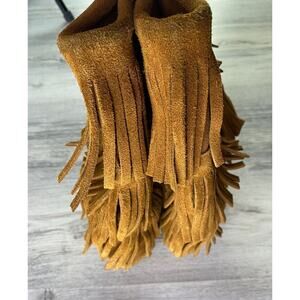 Minnetonka Brown Suede Moccasin Calf Boots 3 Layer Fringe 1632 Women’s Size 6