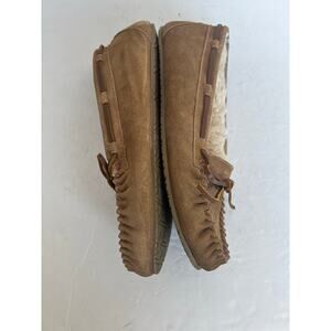 Minnetonka Cally Brown Suede Slip On Faux Fur Lined Bow Flat Slipper Shoes Sz 10