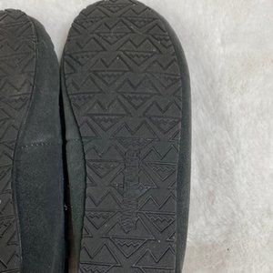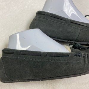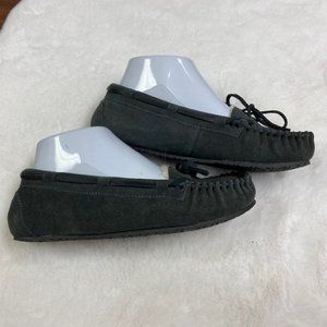 Minnetonka Cally Gray Leather Moccasin Slippers Women's 6 Faux Fur Lined